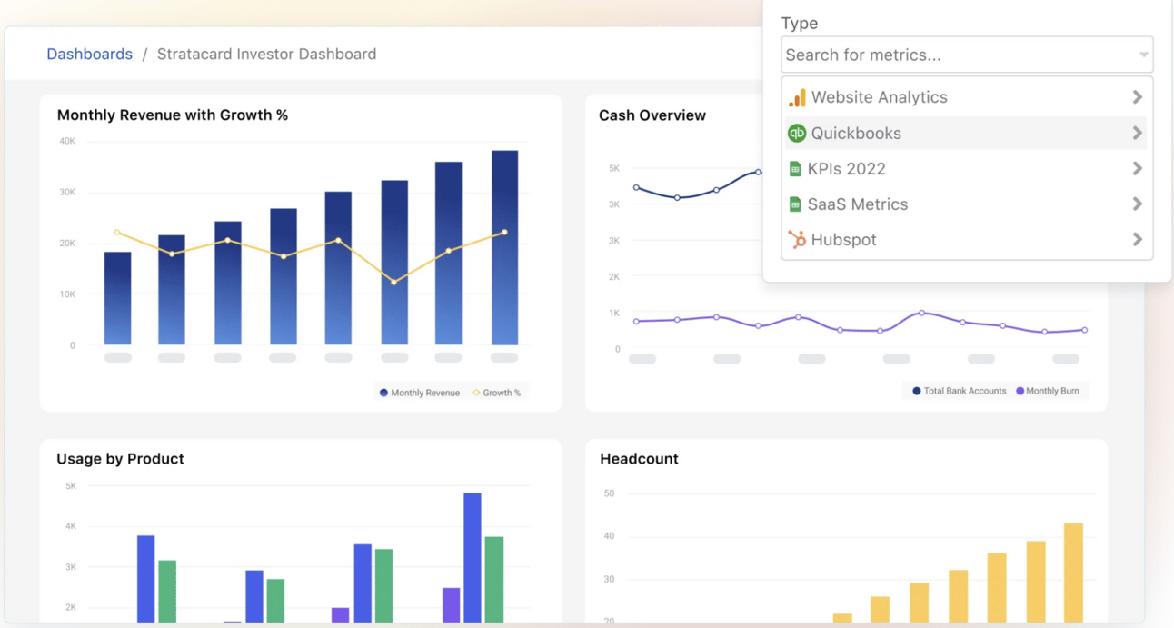 KPI Tracking: Easily monitor important metrics like burn multiple and ARR in real time.