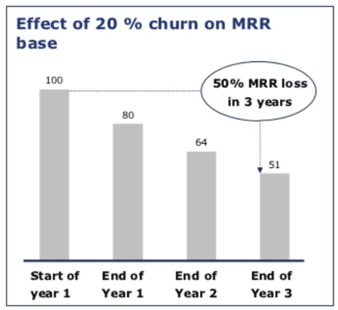 One of the biggest drivers of the long-term profitability of a firm is its renewal rate. In today’s world, acquiring new customer is 5X more expensive than retaining one. To not focus on renewal and retention strategies can spell doom for a business. For example, when a 20% churn on MRR is left unattended, it grows to a 50% churn rate in a matter of 3 years.